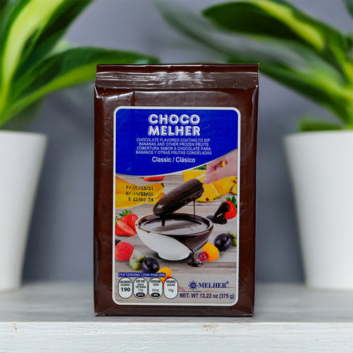 Cobertura sabor a chocolate lista para derretir y bañar frutas congeladas como bananos, fresas y piñas.