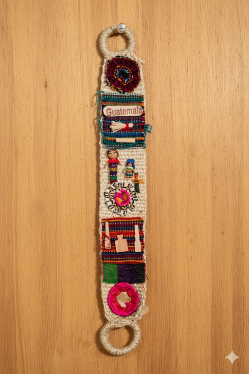 Adorno artesanal tejido a mano con motivos típicos guatemaltecos. Incluye muñecos quitapenas y bordados coloridos.